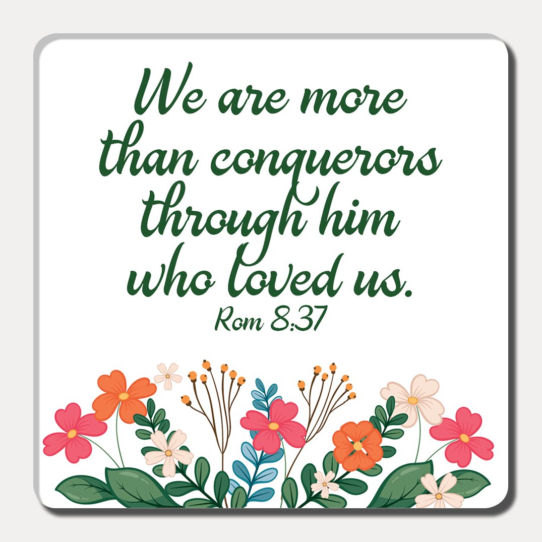 - Bible verse or wording on magnet: We are more than conquerors through him who loved us.