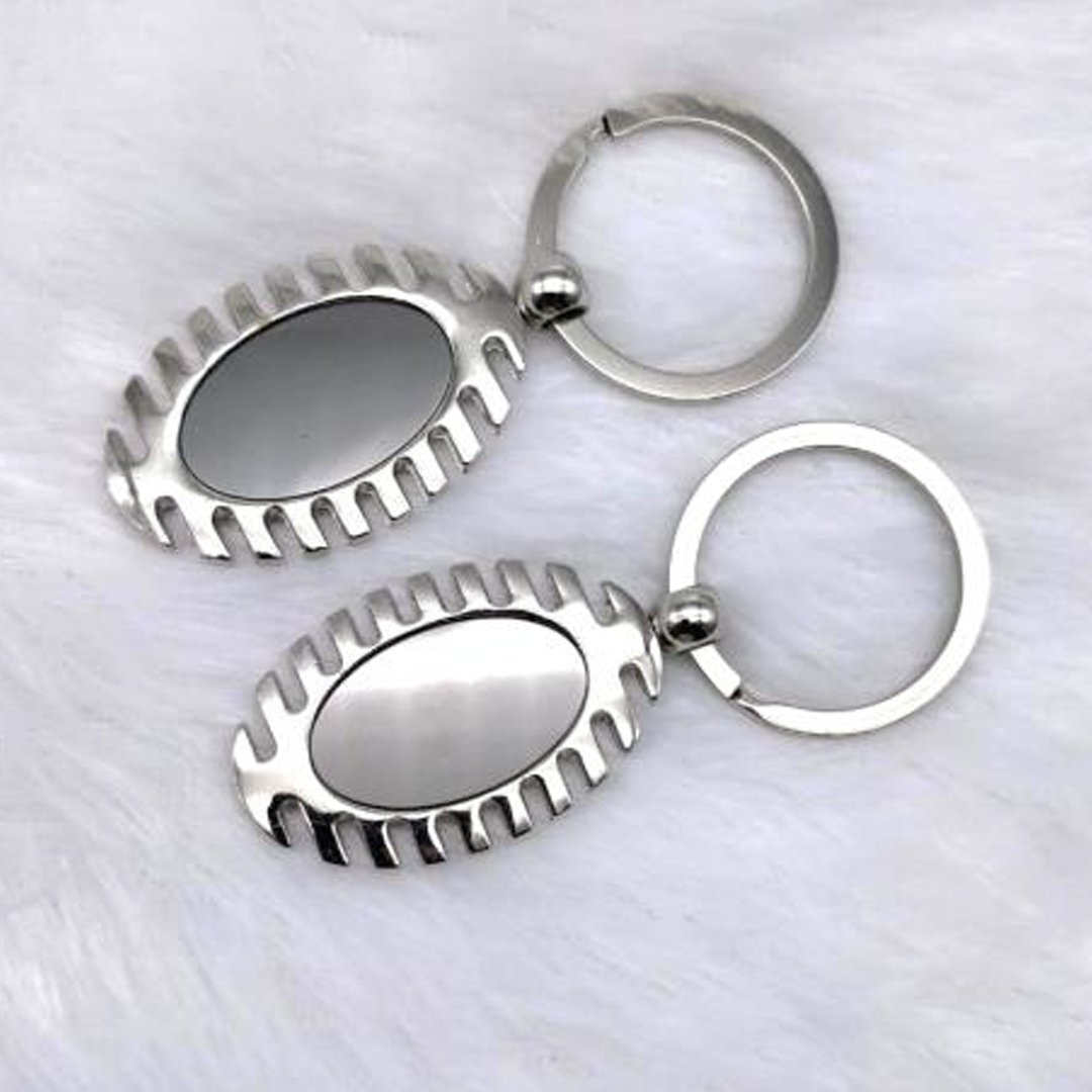 A premium metal key ring featuring a unique oval-shaped design